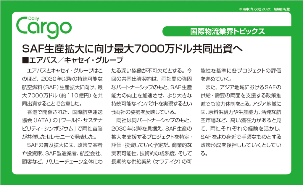 SAF生産拡大に向け最大7000万ドル共同出資へ