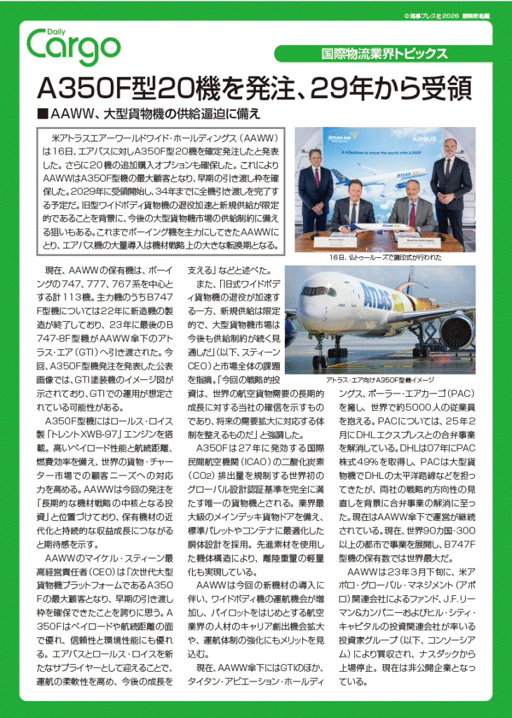 A350F型20機を発注、29年から受領
